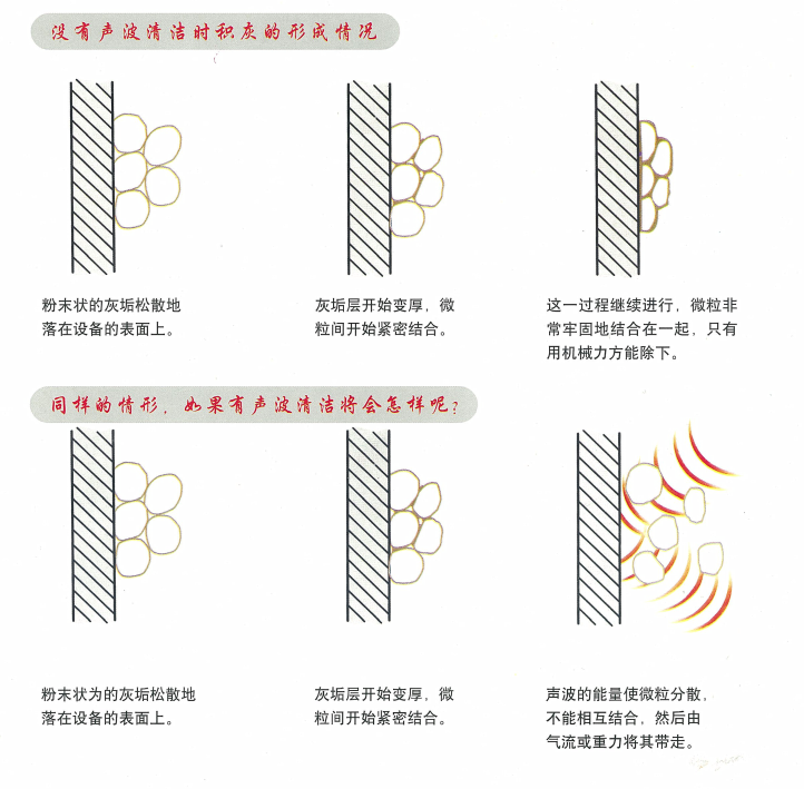 聲波清潔的基本原理是,通過(guò)產(chǎn)生一個(gè)帶有一定能量的聲波,抵消游浮在氣流中灰垢的聚集力或表面粘附力,以阻止其相互之間結(jié)合成一硬殼層